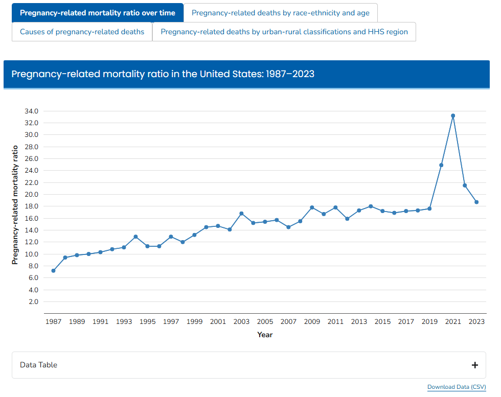 In 2025, after completing the analysis of 2023 PMSS data, the CDC launched a new dashboard that allows users to view data trends over time and toggle between different years to see the leading causes of pregnancy-related deaths that year, as well as pregnancy-related deaths by race-ethnicity, age, urban-rural classification, and HHS region.